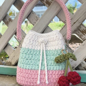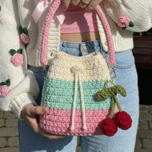 Cherry Blossom Crochet Bucket Bag – Handmade Cotton Knit with Cherry Charm