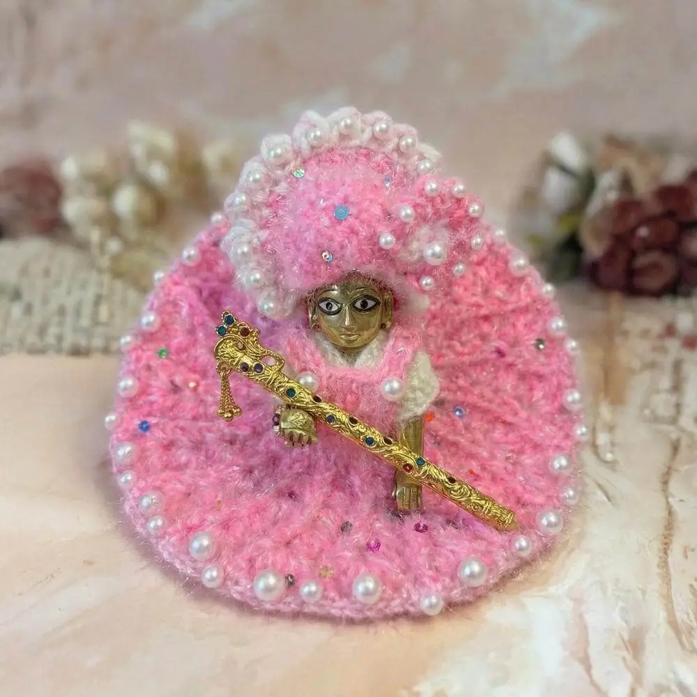 A soft pink crochet outfit for Kanha Ji, detailed with pearls and tiny sparkles. Handcrafted using premium soft wool, designed to keep Thakur ji cosy during the cold season.